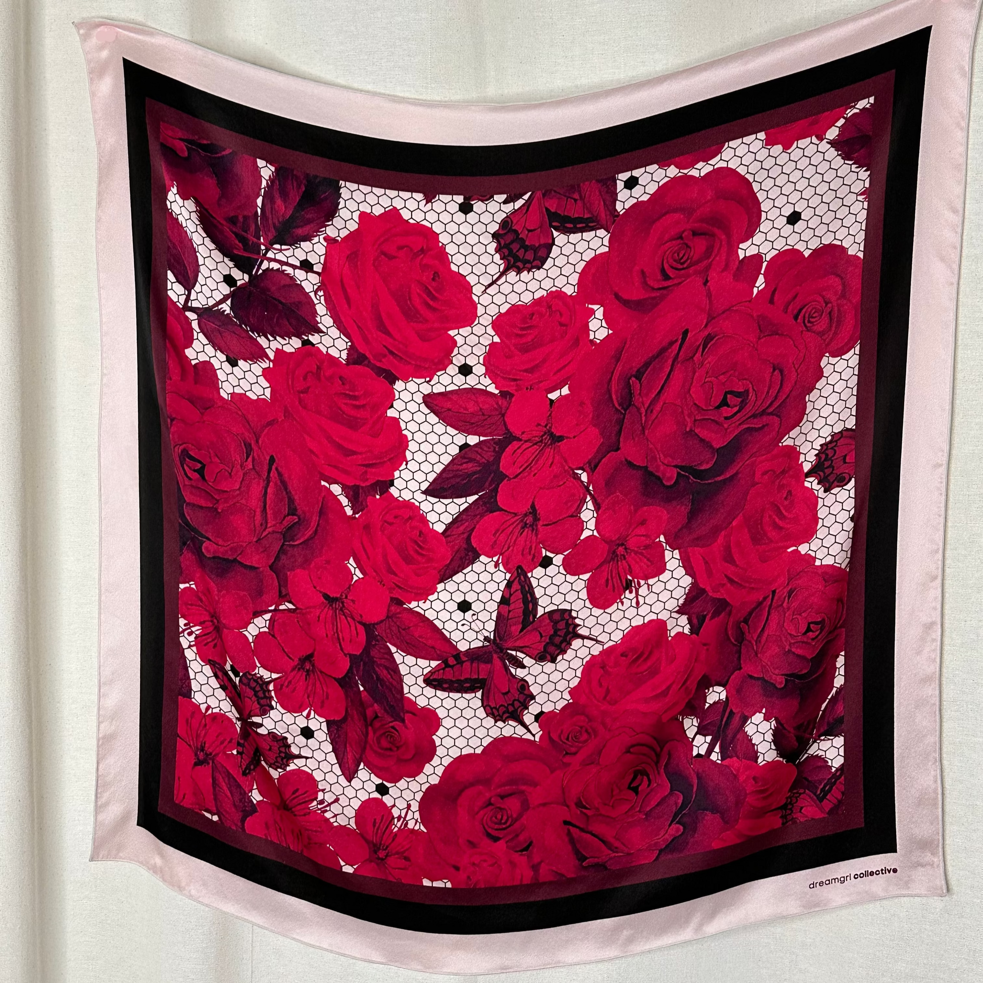 Crafted from luxurious Silk Charmeuse, this scarf captures the essence of feminine elegance. Intricate lace motifs dance alongside vibrant roses while delicate butterflies flutter through the design, creating a romantic tapestry that speaks to the soul.
